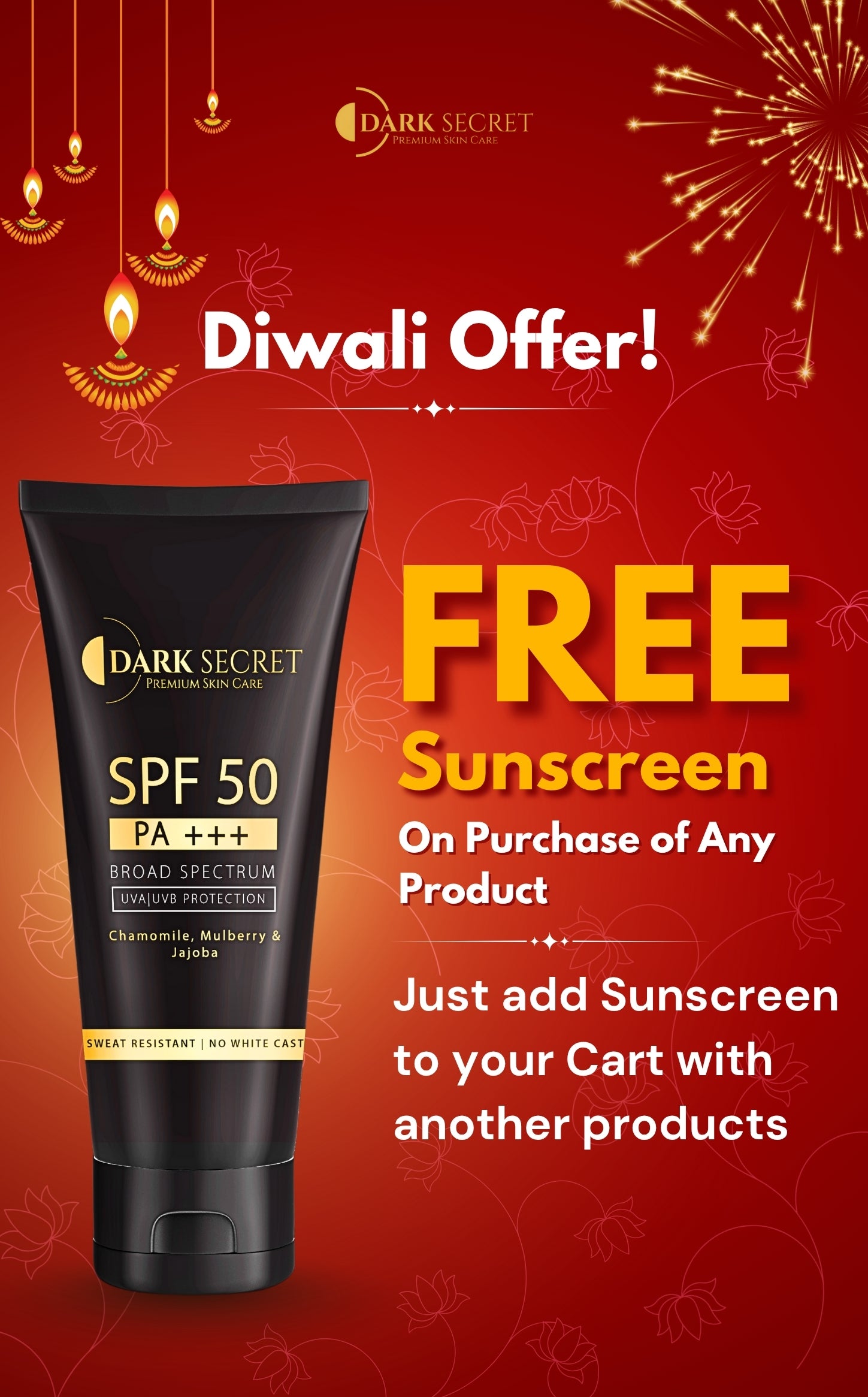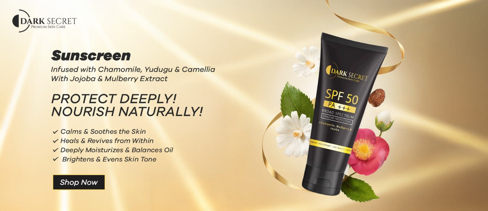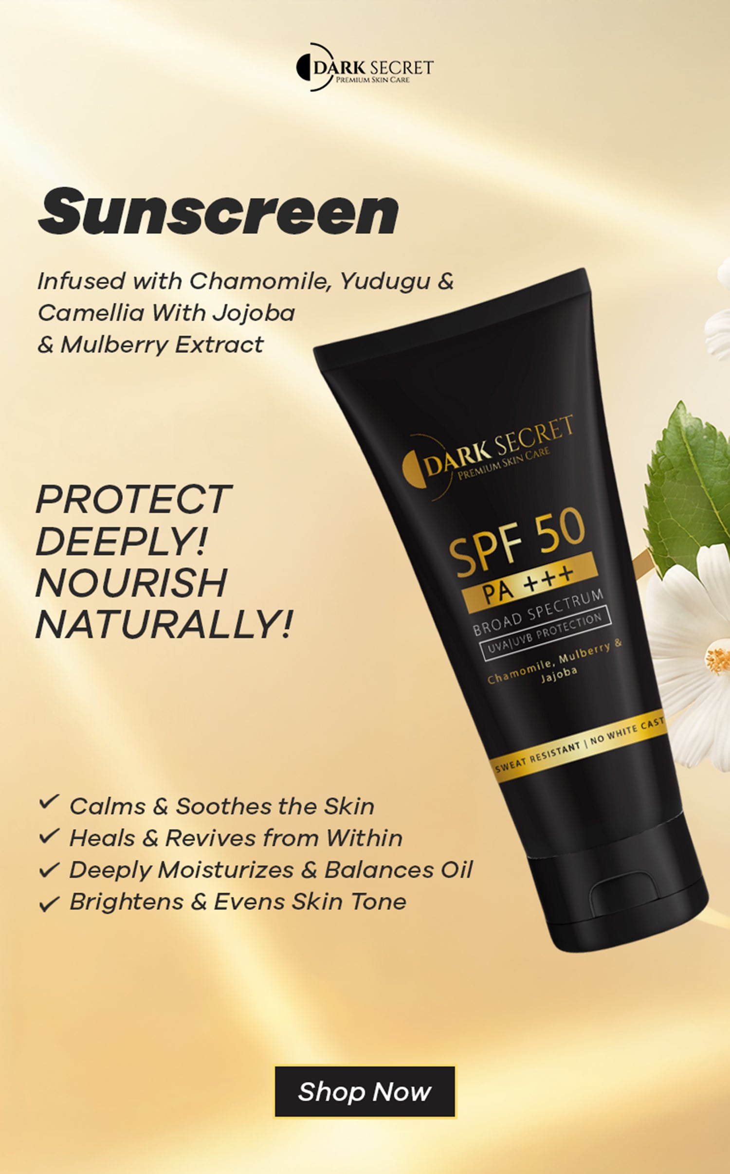 The Dark Secret SPF 50 sunscreen absorbs instantly without greasiness or white cast. It brightens skin tone and keeps it protected all day. Ingredients like chamomile and mulberry calm and rejuvenate.