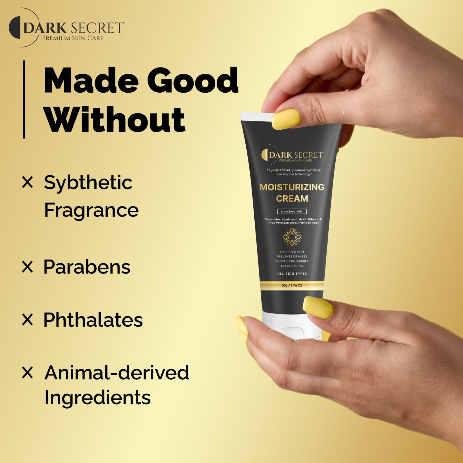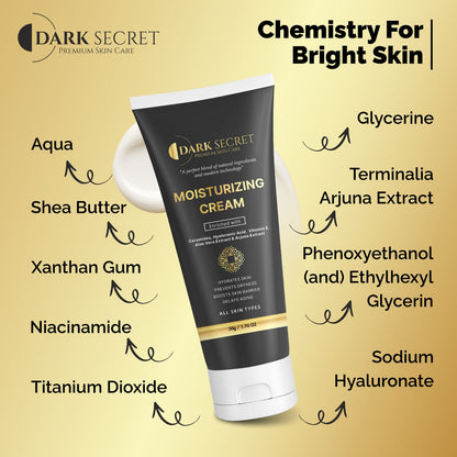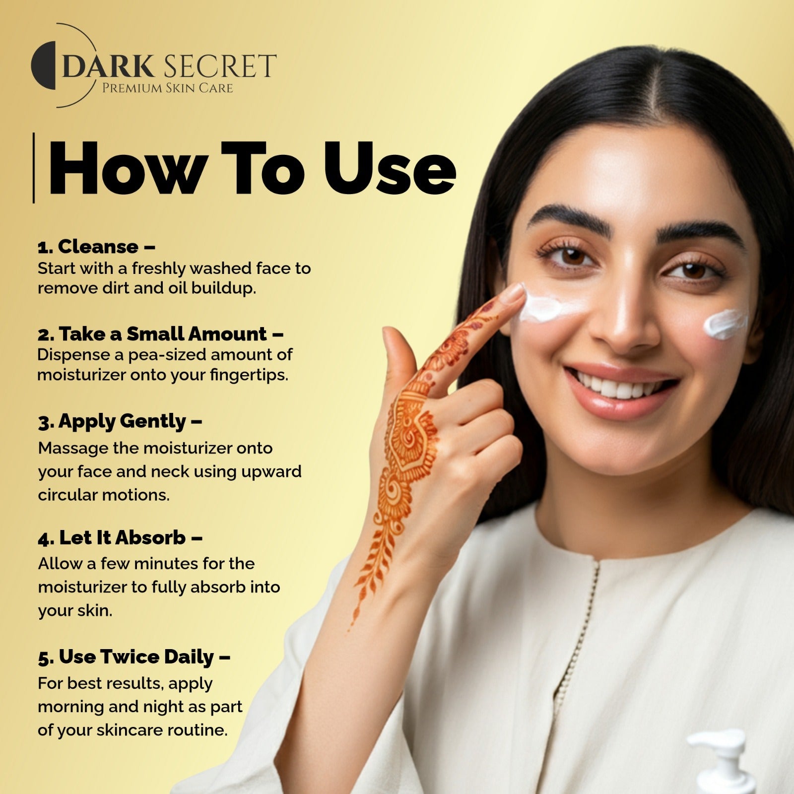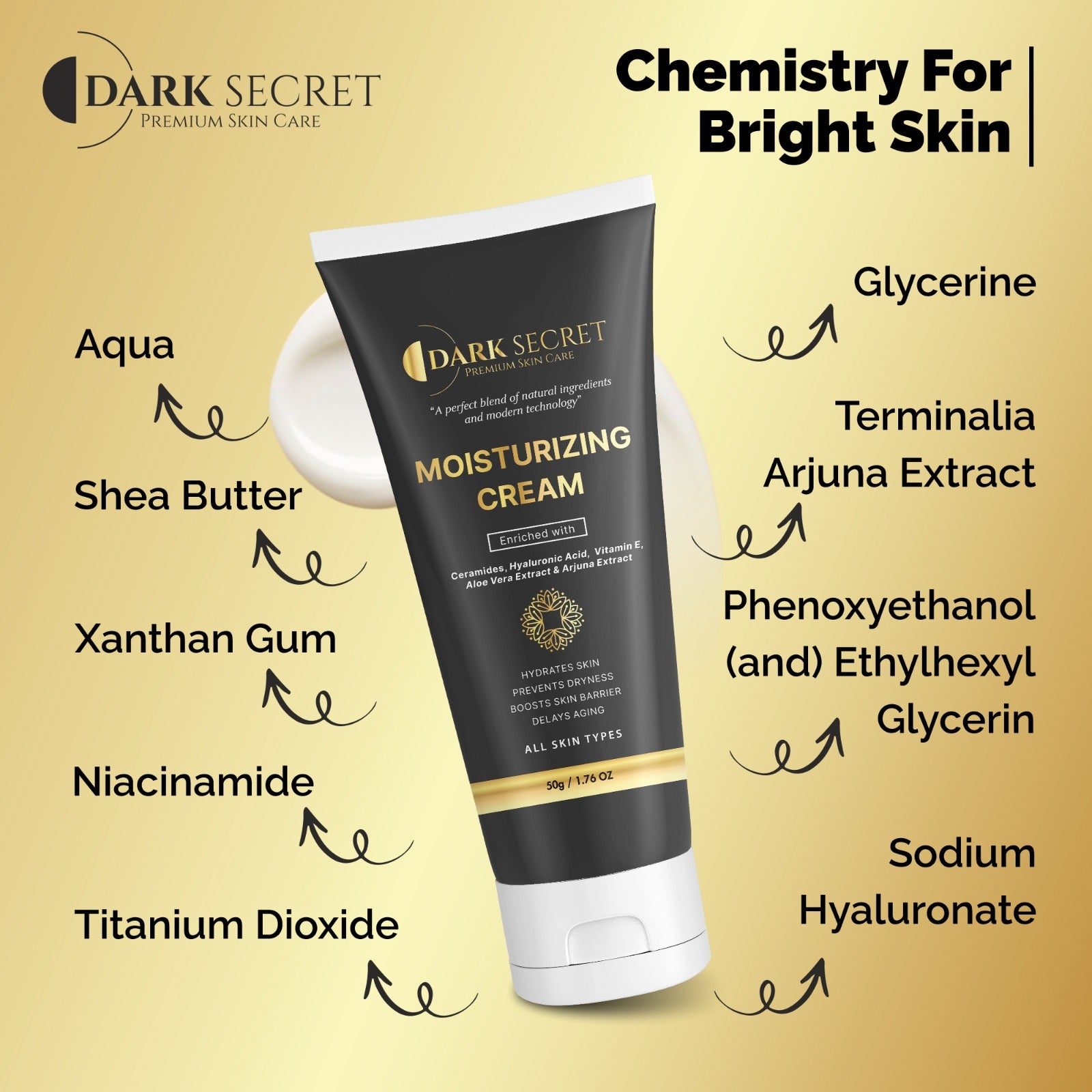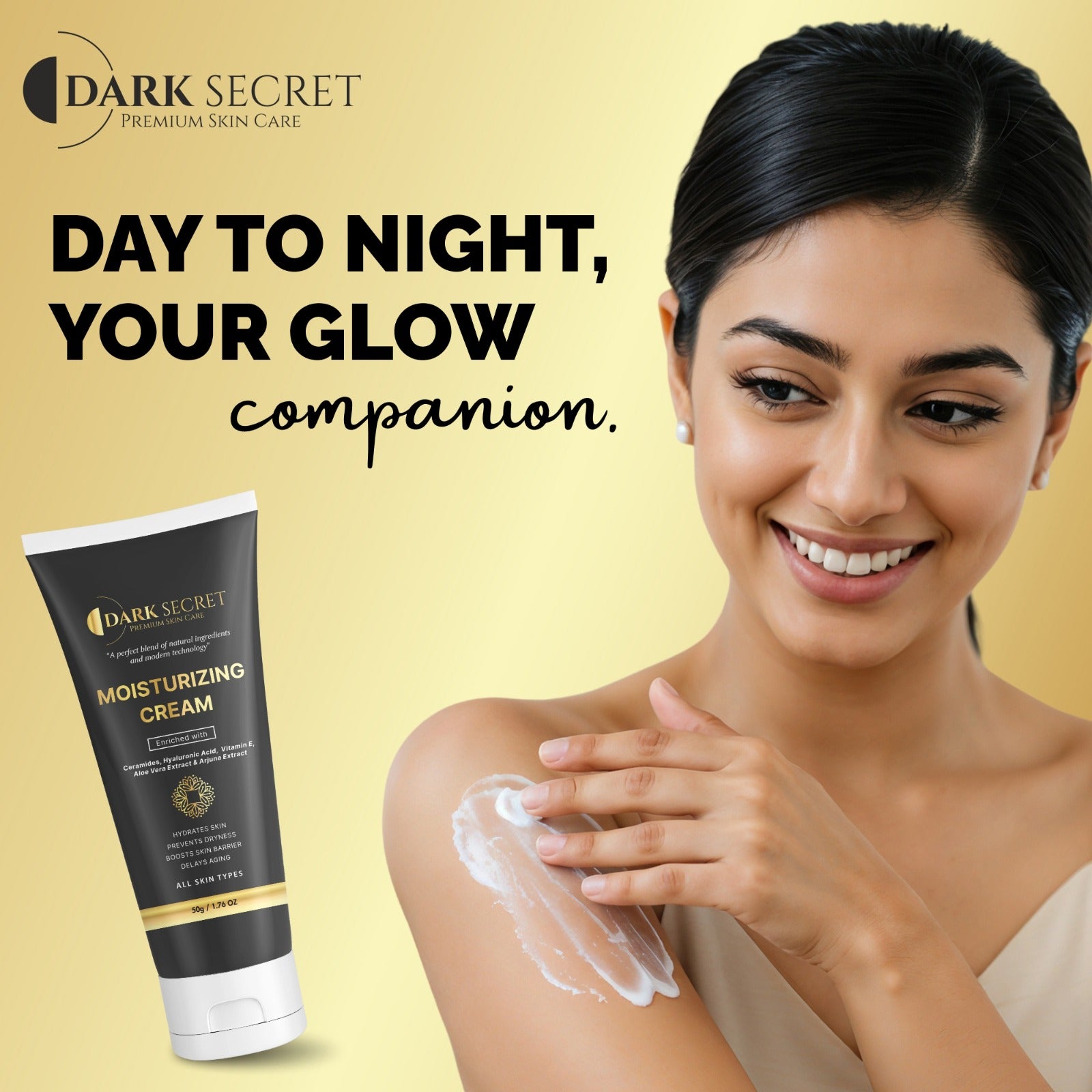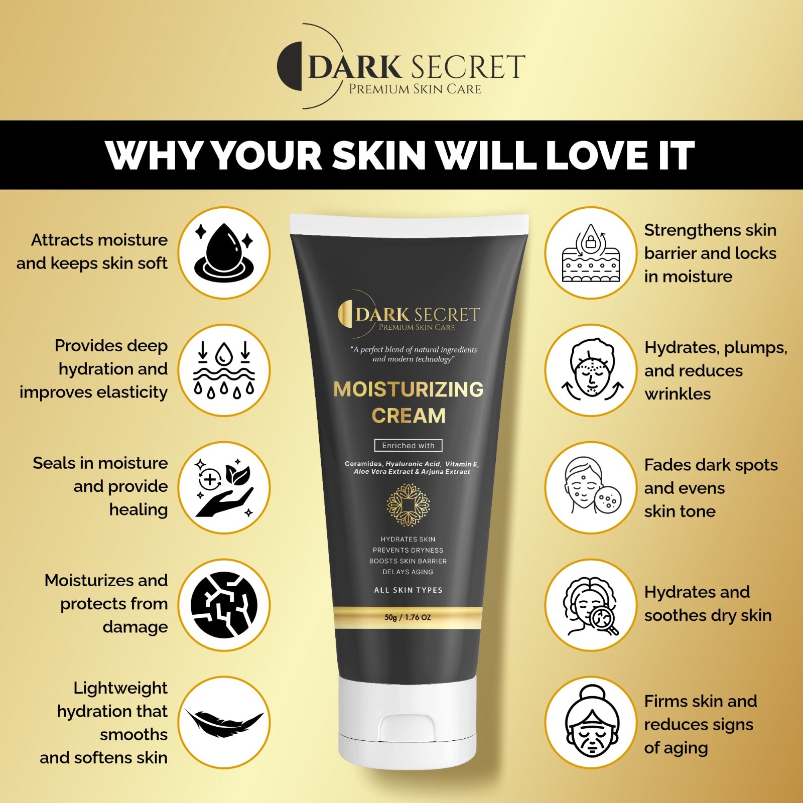A moisturizer cream hydrates, nourishes, and protects your skin, helping to prevent dryness and maintain a healthy barrier. The Dark Secret Moisturizing Cream is enriched with skin-loving ingredients that lock in moisture, smooth texture, and keep your skin soft and supple all day. Regular use also supports skin repair and can improve the appearance of fine lines over time.
