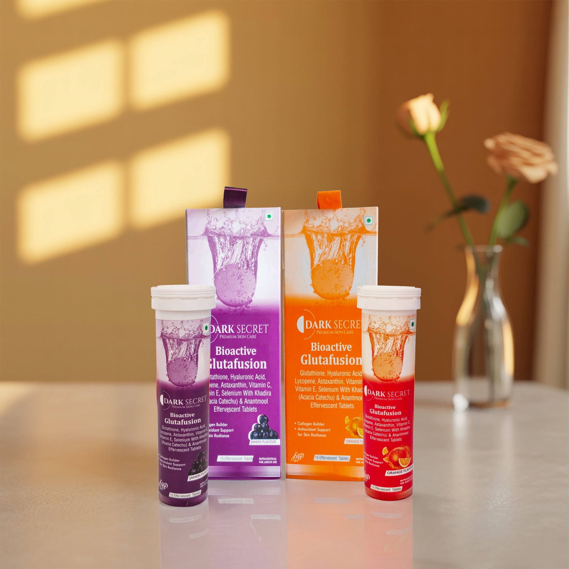 Dark Secret Tablet Combo (Orange & Jamun) is packed with Glutathione, Hyaluronic Acid, Vitamin C, and powerful antioxidants to brighten, hydrate, and protect your skin from within. These effervescent tablets boost collagen, fight pigmentation, and support clear, glowing skin with better absorption. Refreshing and effective, perfect for daily skin wellness.